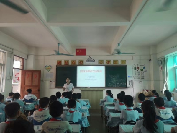 為貫徹落實“十一”長假期間學校對于學生安全教育及管理工作方面的要求,確保廣浩學校學生能夠提高自我防護意識,度過一個安全愉快的假期。9月30日,廣浩學校德育處組織全體師生開展國慶節放假安全教育主題班會。