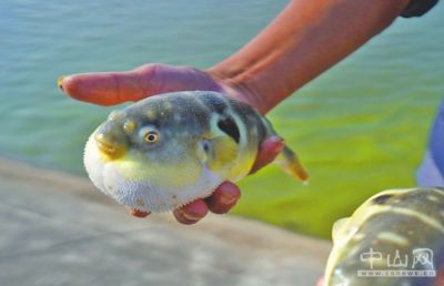 嘟嘴,胖腹,瞪眼,青背白肚,放在手中片刻,白白的肚子便鼓起來,遠遠望去就像一個圓滾滾的氣球。1月15日下午,在?;菟a養殖基地,員工唐伯撐著小木船,劃到魚塘中央,提起喂料魚罾,將近10條河鲀魚放進大盆中,供大家觀看。