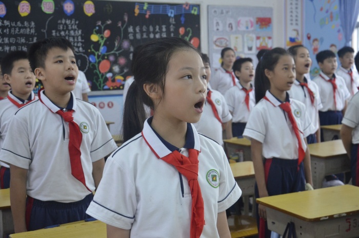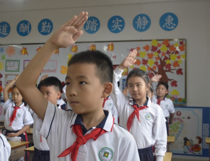 教室里,各班的主題隊(duì)會(huì)開展得有聲有色。中隊(duì)輔導(dǎo)員帶領(lǐng)隊(duì)員們重溫入隊(duì)誓詞,向隊(duì)員們講述少先隊(duì)的發(fā)展歷程,以及中國女排等先鋒人物的榜樣力量。飄揚(yáng)的紅領(lǐng)巾,崇高的隊(duì)禮,“少先隊(duì)員”是我們最驕傲的名稱,“我們是共產(chǎn)主義接班人”是我們最嘹亮的歌聲。