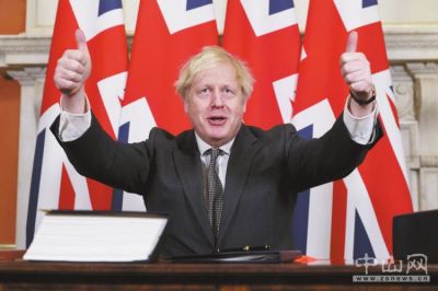 2020年12月30日,在英國倫敦的首相府,英國首相鮑里斯·約翰遜在英歐未來關(guān)系協(xié)議上簽字后慶祝。 新華社 發(fā)