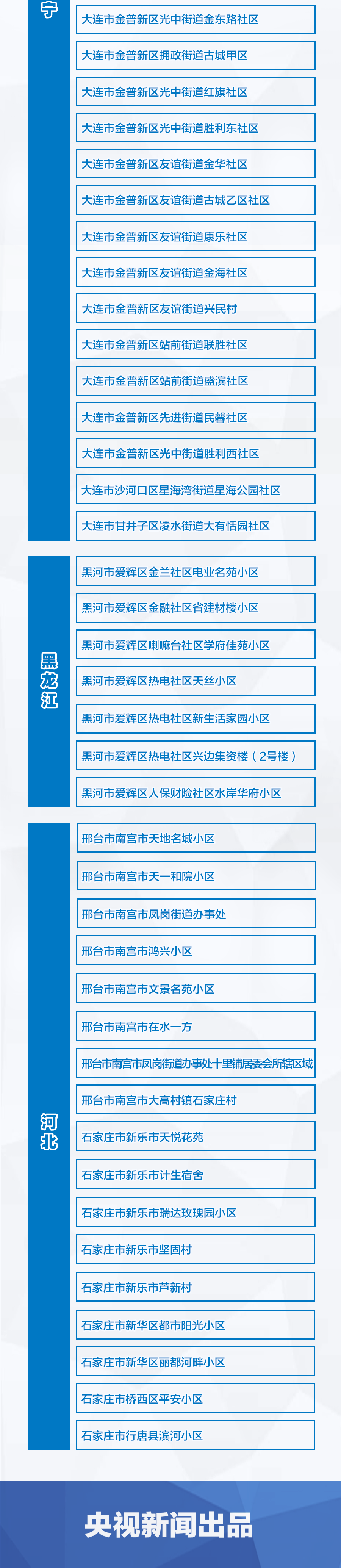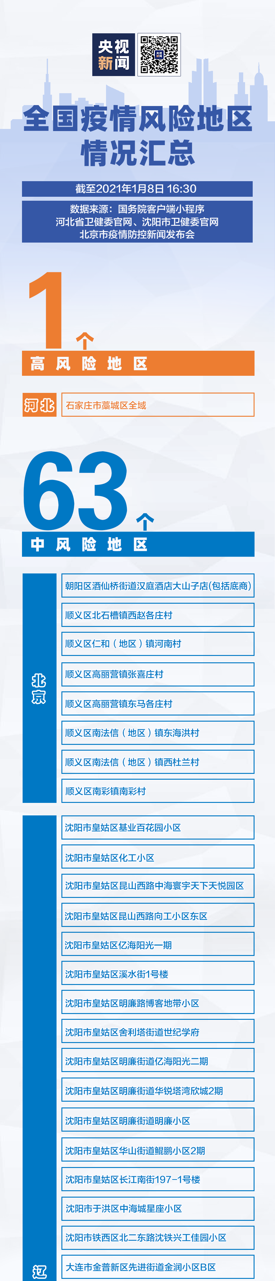 1月8日起,河北省石家莊新樂市天悅花苑、計生宿舍、瑞達玫瑰園小區、堅固村、蘆新村,新華區都市陽光小區、麗都河畔小區,橋西區平安小區,行唐縣濱河小區調整為中風險地區。