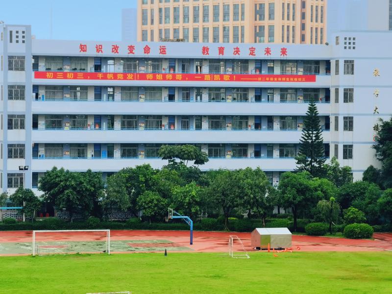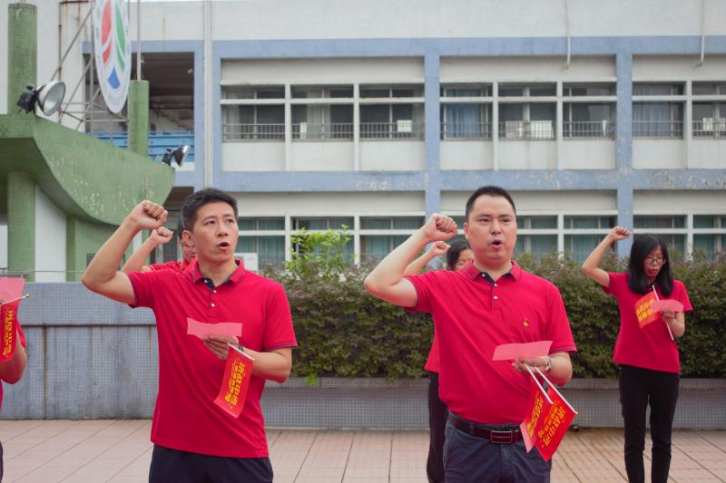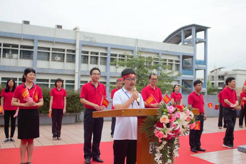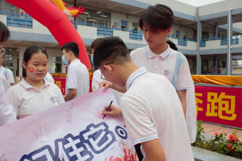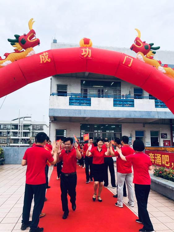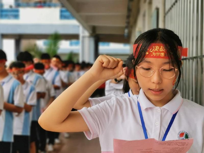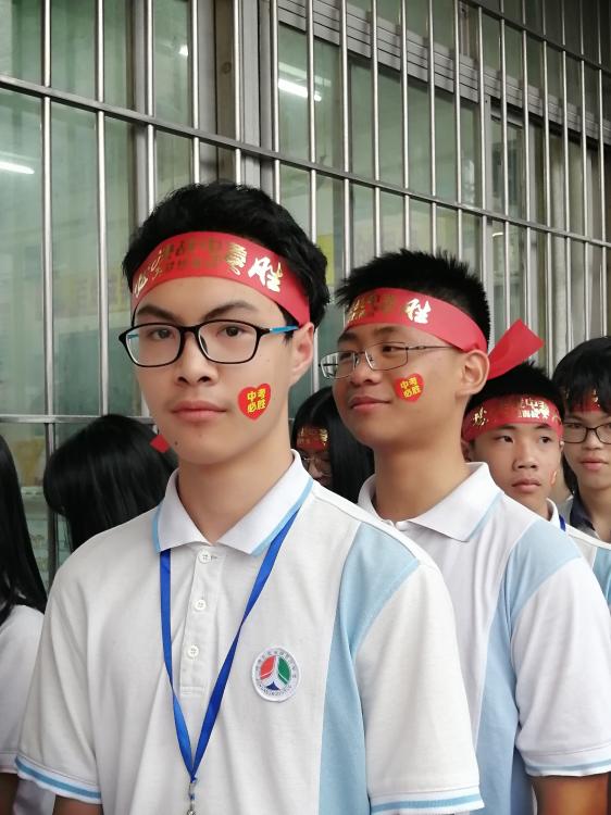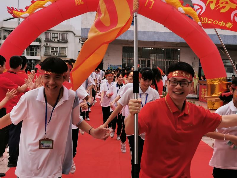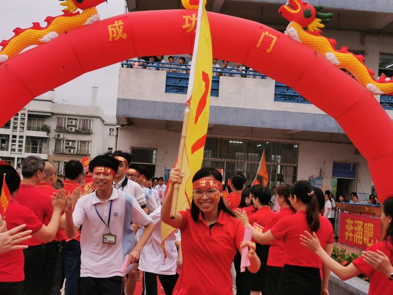 瞬時,同學們那渴望而又激動的眼神聚焦于“成功門”,仿佛那就是心之所盼的未來!各班的領隊同學都默默地緊握班旗的旗桿,在班主任的帶領下,同學們整理好額上的紅絲帶,邊氣勢如虹地高喊口號邊有序地走過“成功門”。“成功門”兩側早有初三級的科任老師列隊靜候著,他們為初三學子搖旗吶喊,擊掌壯行,為這莊嚴的場面增添了一份溫情!
