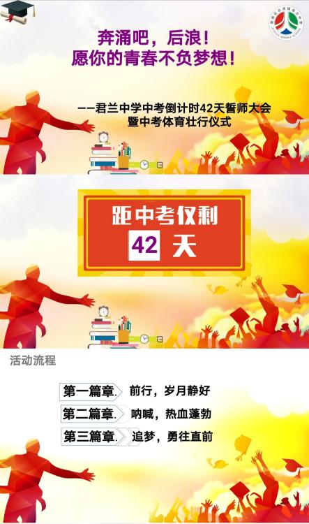 離中考只剩42天,為了讓青春在奮斗中綻放,激勵初三學子竭盡全力、砥礪前行,圓夢中考;讓激情澎拜、感動常伴,2020年6月8日上午,君蘭中學初三級舉行了“奔涌吧,后浪!”為主題的中考誓師大會暨體育中考壯行活動。該活動有學校行政領導、初三級全體師生及初一級助威學生參與,由楊蓉級長主持。