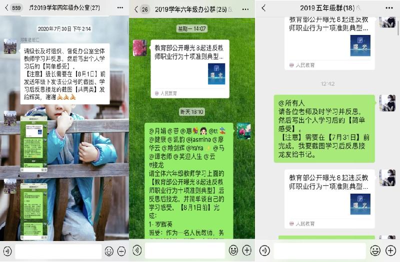“師者,以德為先”。高尚的師德師風(fēng)是教師從事教育工作的靈魂。為了進一步加強教師隊伍建設(shè),不斷提高教師職業(yè)道德素質(zhì)和師德修養(yǎng),保障全體教師在良好師德師風(fēng)塑造和學(xué)習(xí)中的不松懈和持續(xù)性,7月27日-30日,在暑假期間,龍江城區(qū)中心小學(xué)組織全體教師在線上重點學(xué)習(xí)了“教育部公開曝光8起違反教師職業(yè)行為十項準(zhǔn)則典型問題”一文,并進行了自我反思和學(xué)習(xí)心得的分享交流。