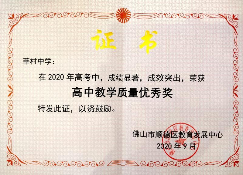 在剛結束的順德區(qū)2020年高考質量分析會上,我校憑借優(yōu)異的高考成績再次榮獲“順德區(qū)2020年高中教學質量優(yōu)秀獎”,這是我校自2018年以來,連續(xù)三年獲此殊榮!