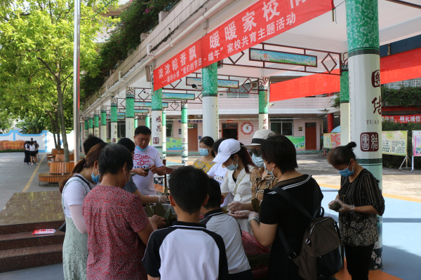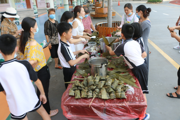 在校園里與學生一起動手裹粽子。家長親手教學生學習怎么裹粽子,看起來簡單的技巧,操作起來也不容易。學生在有序地、滿滿地操作中感受那種傳統習俗,傳統文化,為民族文化的傳承努力著。雖然裹出來的粽子并沒有家長們裹得那么美觀,但從實踐中感受的卻是豐富而快樂!