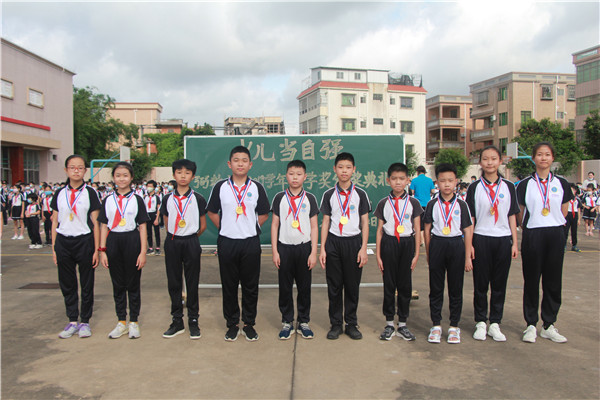 大會開始前,張敏靈老師宣讀了獲得“成學獎”名單,受表彰的同學滿懷欣喜地依次走上領獎臺。梁幸秋校長和王瓊虹副校長,親自為中高年級前10名及中低年級前15名的優秀學生頒發了“成學獎”獎牌,還為獲得“五成學子”獎“德、智、體、美、勞”全面發展的學生頒發了獎杯,并與他們合影留念。在燦爛的陽光下,弼教學子胸前閃耀著光榮的獎章,手舉著沉甸甸的獎杯,這一刻值得紀念!