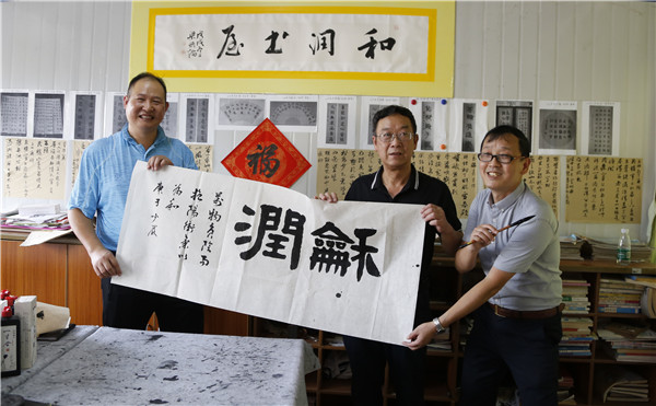 專家們走進“和潤書屋”,看到一幅幅學生洋洋灑灑的書法作品,當場感受到濃濃的文化熏陶,他們也忍不住內心的激動和熱情,現場揮筆疾書,題下“和潤”和“香遠益清”兩幅墨寶,并以此作為對“和潤教育”的肯定,贈予學校留念。