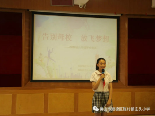 畢業典禮由我校黃曉芳副主任主持。典禮伊始,全體六年級師生觀看了由兩個班級班主任精心制作的畢業視頻,一幀幀,一幕幕,所有的時光碎片,都是這個畢業季珍貴的影像。看著自己從稚嫩天真的孩童到日漸成熟,青春活力的少年,看著六年活動里的師生同心和歡聲笑語,在場的同學感觸良多,有的還偷偷抹掉了眼角的淚水。隨后,六年二班的陳佳玲同學作為畢業生代表發言,表達了全體畢業生對母校和老師們的感謝,也立志將來要做成為母校驕傲的社會棟梁。接著,進行畢業證書頒發儀式,全體行政和六年級科任教師為六年一班、六年二班學生分別頒發證書,并為學生送上畢業祝福,畢業生們也用自己班級響亮的口號表達心中的感激之情。