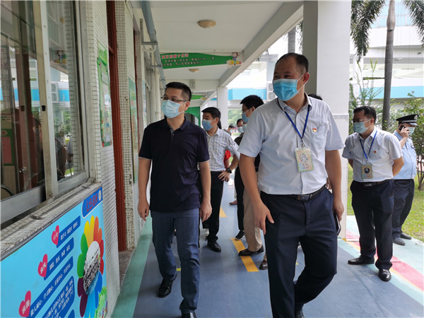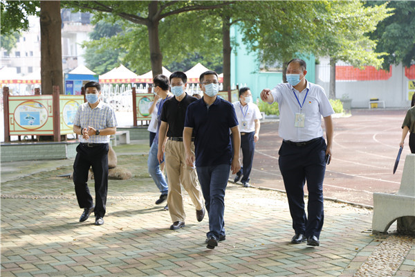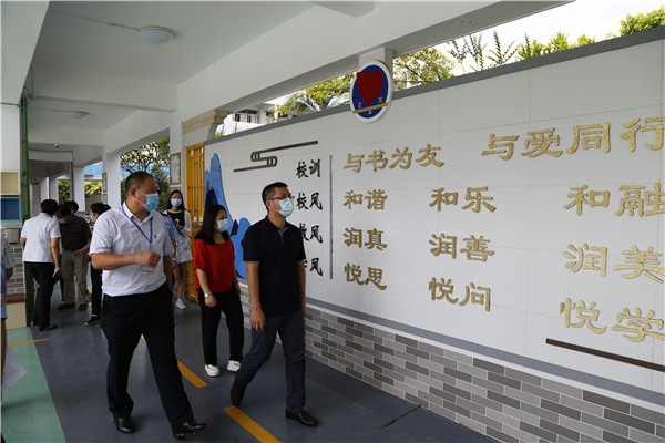 容鎮長一行首先巡視了學校“和美”的校園生態環境。在綠樹濃蔭下,容鎮長贊嘆學校綠化面積大,課室明亮整潔,為陳村學子創設了健康舒適的學習場所。容鎮長一邊巡察校園,一邊詳細詢問學校開學的準備工作,了解疫情防控措施等情況,他充分肯定了學校各項工作做得細、做得實,也為教師們送上了新學期祝福。