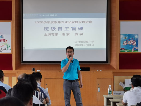 暑去秋來,學期伊始;使命催征,時不我待。為進一步貫徹2020年陳村鎮教育高質量發展座談會的精神,同時為了培養教師的德育素養,獲取多元化的教育途徑,了解德育新動態,全面提升教師的育德水平和創新能力,打造一流的師資隊伍,2020年8月31日陳村鎮初級中學邀請南京市第二十七高級中學陳宇老師為全校教師做了題為“讓學生成為班級管理真正的主人――班主任引導下的學生自主管理”的培訓講座。