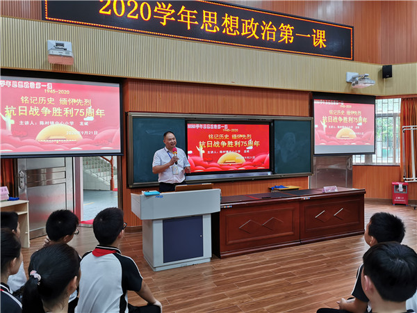 為了紀念中國人民抗日戰爭暨世界反法西斯戰爭勝利75周年,9月21日上午,陳村鎮中心小學開展了題為《銘記歷史,緬懷先烈》的校長思想政治第一課。龍斌校長主講,六年級全體同學和教師聆聽了此次校長思政課。