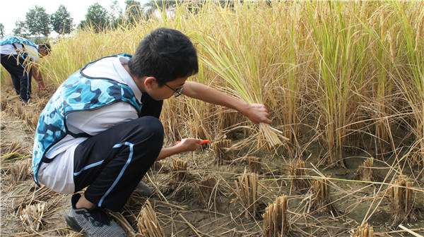活動包括收割稻谷、扎稻草人、心肺復蘇安全教育、田園野炊生存活動、集體游戲等多個精彩環節。最令人難忘的,無疑是本次研學課程的“重頭戲”――收割稻谷。在導師講解了收割稻谷的注意事項、展示收割的技巧后,同學們都躍躍欲試。挽起褲腿,拿起鐮刀,彎下身子,割下一株株金黃的稻子,然后到脫粒機前進行脫?!粗馉N燦的稻谷在谷倉里跳動,同學們顯得格外興奮,體驗到了豐收的喜悅,忘了汗水和泥土帶來的酸痛。中午時分,同學們又開始了田園野炊活動,只見同學們分工合作,洗菜、切菜、炒菜、做飯……忙得不亦樂乎,最終吃上了自己做的午餐,這一餐不僅特別美味,還深切體會到了父母常年做飯的艱辛,懂得了增強生活自理能力的重要性。