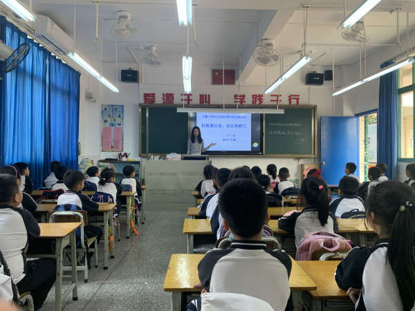 同時,其他年級的學生在班里舉行“垃圾要回家,請您幫助它”主題班會。在班會課上,低年級由班主任帶領、高年級有班干部帶領開展班會課,利用多媒體,向學生宣傳了垃圾分類的知識:什么是垃圾分類、垃圾分類標準、垃圾分類標識,以及不實行垃圾分類的危害。學生們認真傾聽學習,樹立節約資源和保護環境的意識。