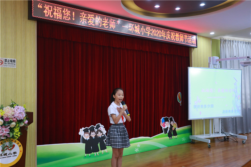 在這特別值得紀念的日子里,學生代表――何韻瑩同學在多媒體室現場帶領同學們一起把《感恩的心》送給親愛的老師們。稚嫩的聲音傳遞著孩子們心中的真情,千言萬語匯成一句話:老師,您辛苦了!