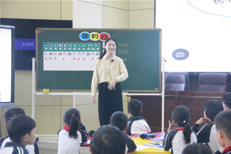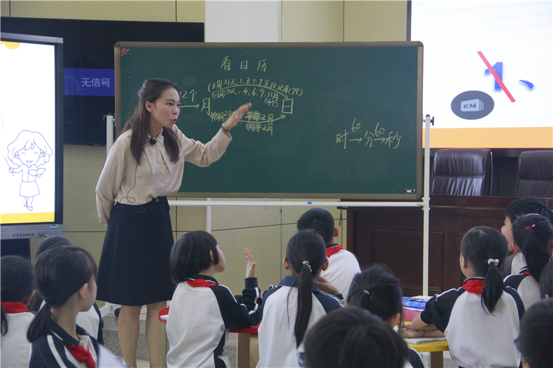 數學科先由我校的鄭華玲老師執教《年月日》和沖鶴小學的夏慧琪老師執教《看日歷》。鄭老師把學生帶回公元紀年的起點,讓學生經歷制訂、修訂古羅馬立法的過程,用古羅馬故事讓學生感受大小月、2月的制訂過程,加深學生的記憶。接著帶領學生在生動的具體情境中,將課本的學習知識恢復為原始的狀態,重新探索計時單位大月小月的確立。同時,將數學文化巧妙融入學生的學習過程,調動學生的積極性,培養學生學數學的興趣。夏老師則用同學喜聞樂見的形式“找不同”引入課堂,在過程中努力地創設合作學習的模式,引導學生投入課堂學習。兩位老師都抓住了本課的教學重點,并將教學目標落實到位,各有特色。