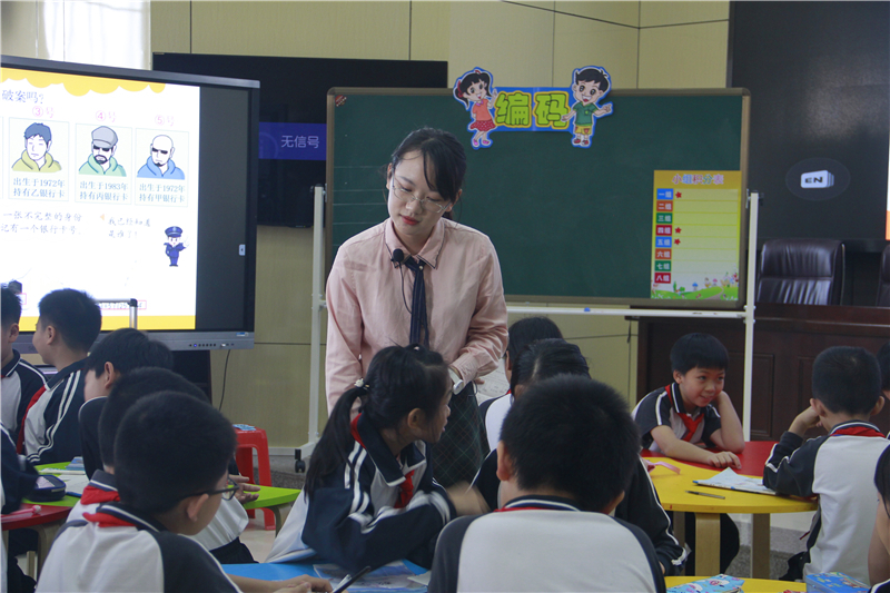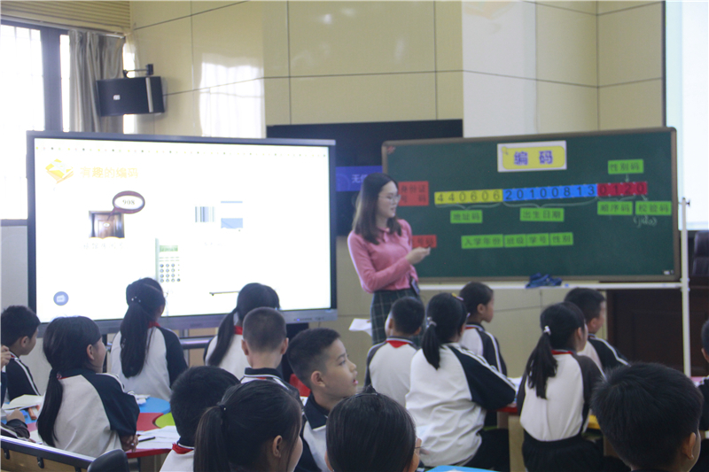 接著,由倫教小學的趙靈老師和昌教小學的陳煜老師分別執教四年級上冊數學好玩中的《編碼》一課。趙老師將導入進行創造性地改編,用學生熟悉的電影導入課堂,吸引學生的注意。陳老師則將靜態的內容轉化為動態的探案過程,將學生拉近課堂,激發學生的探究欲望。