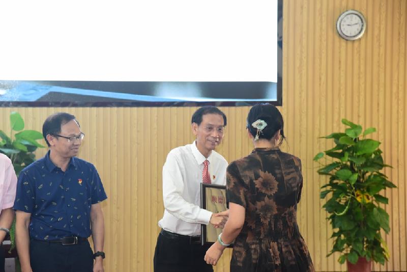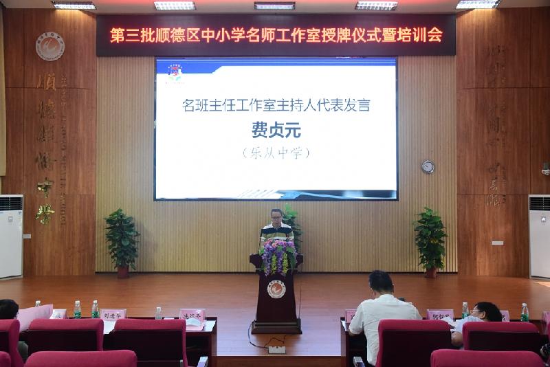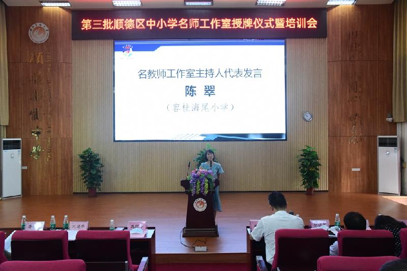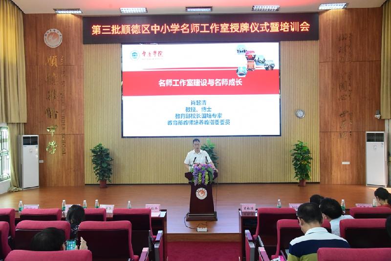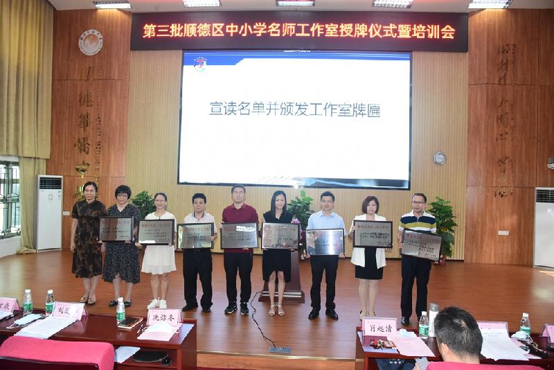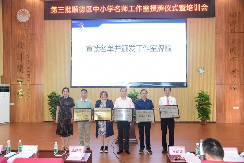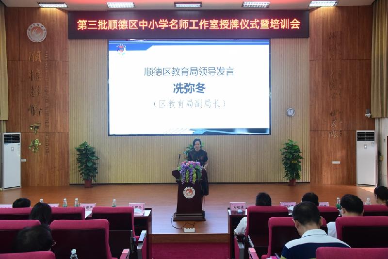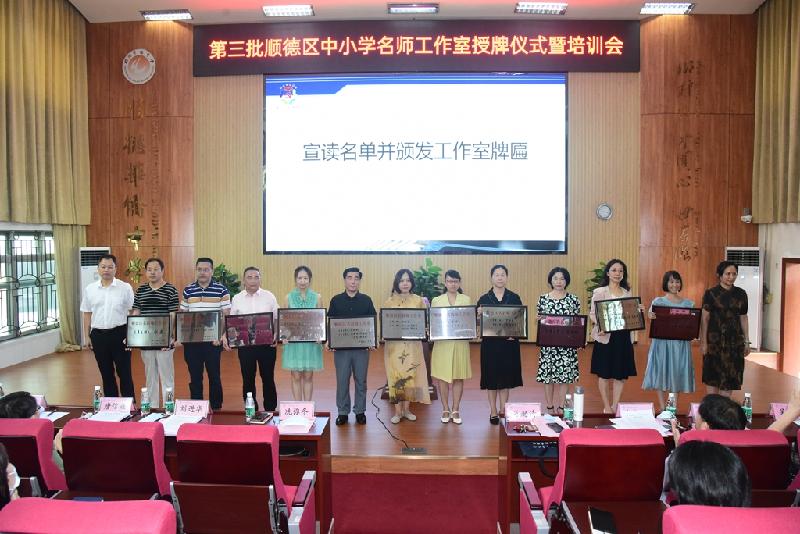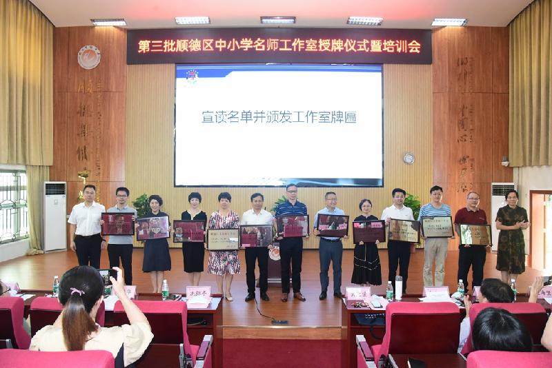 為加快名師隊伍建設,搭建好教師共同發展平臺,6月30日,順德區第三批中小學名師工作室授牌儀式在順德區華僑中學舉行。區教育局冼彌冬副局長、區教育局組織人事科劉進華科長及曾麗輝副科長、區教育發展中心教師發展研究室唐信焱主任、教育部校長國培專家肖起清教授等領導、嘉賓出席會議。