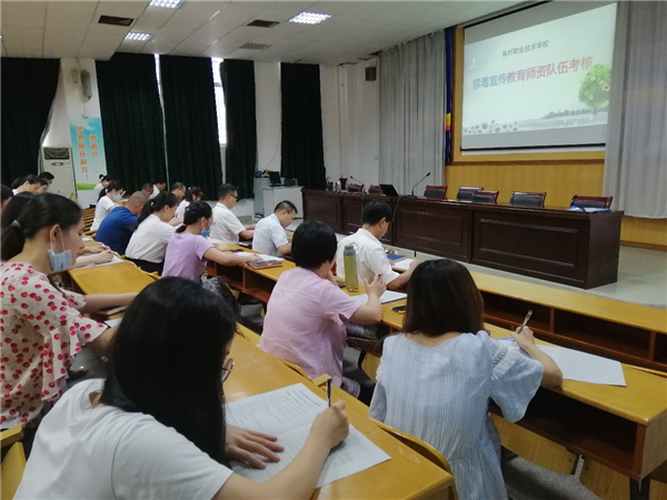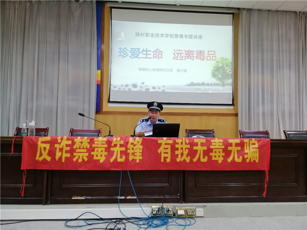 為深入開展禁毒宣傳教育工作,堅決筑牢禁毒防線,全力打造無毒校園,2020年7月6日上午,陳村職校邀請了順德區公安局陳村分局曹少強警官到學校開展了以“加強禁毒教育,構建無毒社會”為主題的禁毒知識講座。全體教師參加了本次活動。