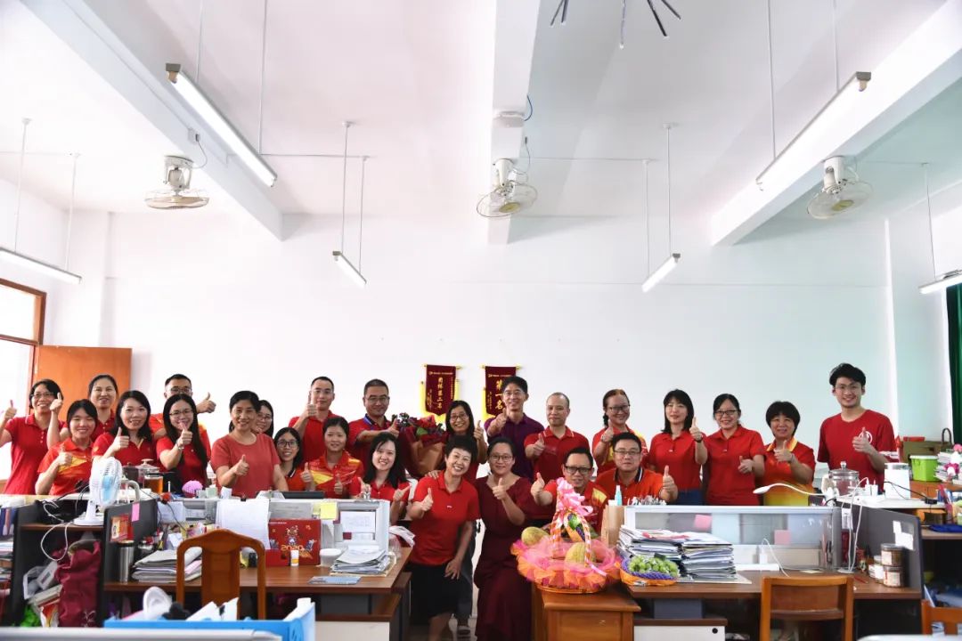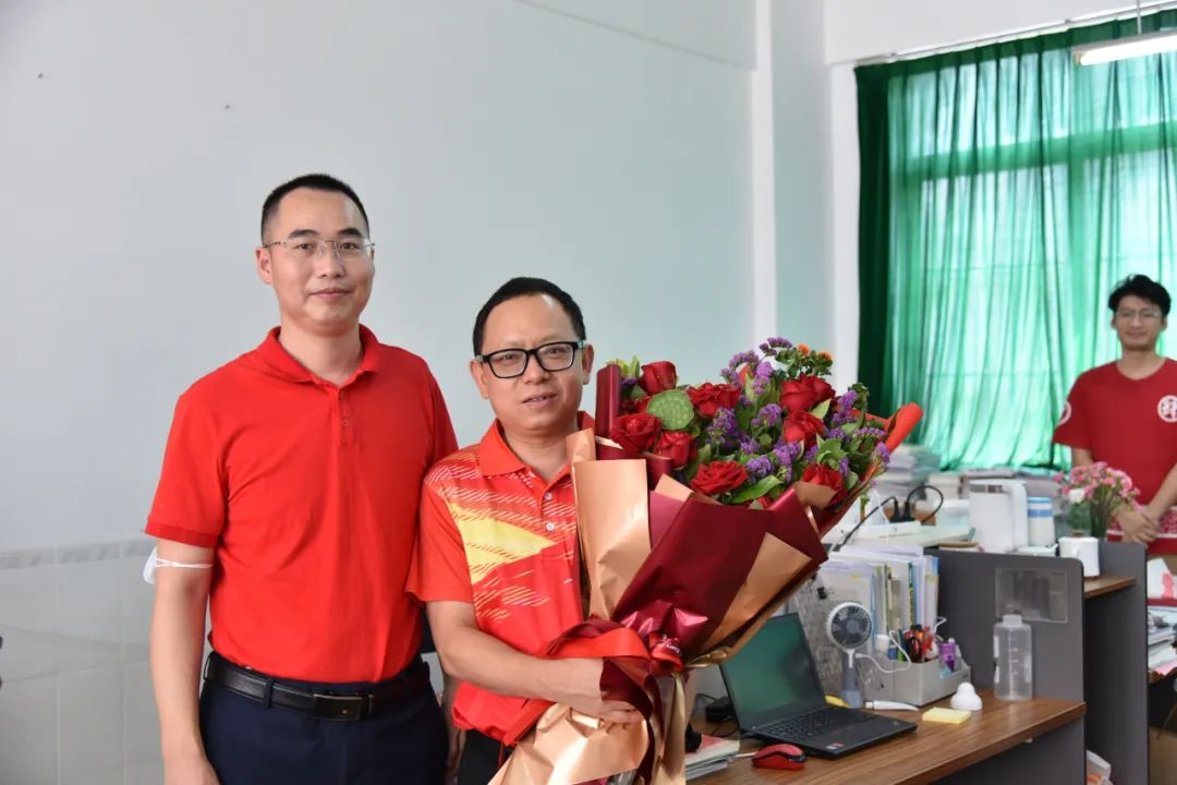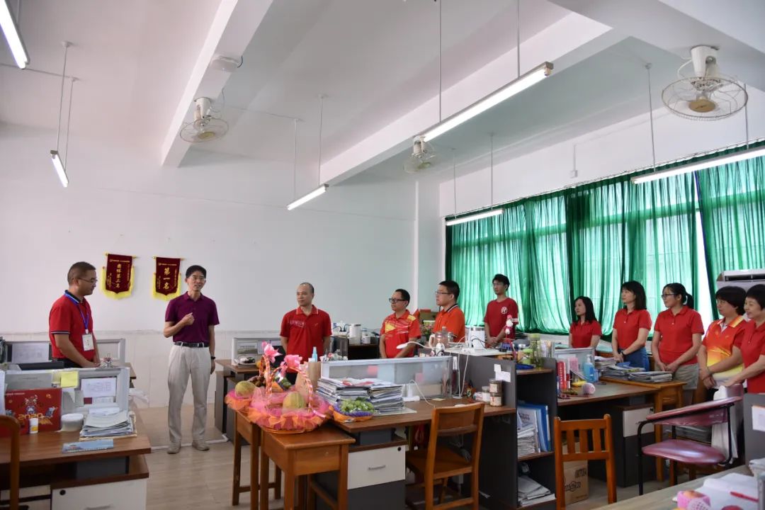 在白建元副校長及陳水繹副校長等的陪同下,張毅副局長一行來到初三教師辦公室為初三老師送上寓意“碩果累累”的夏日水果及寓意“大紅大紫、好事連連”的鮮花,并與老師們進(jìn)行親切交流。