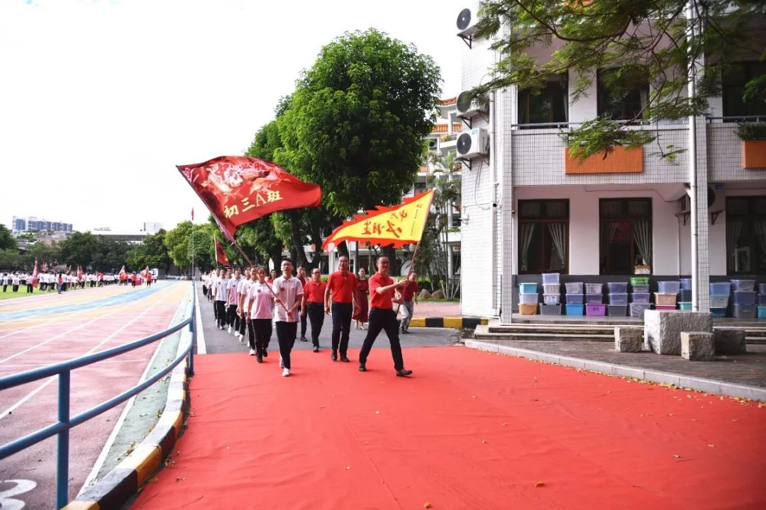 隨后,曾校長為初三級管理團隊授予“中考必勝旗”。與此同時,綠茵場上的各班旗手也舞動手中的“中考必勝旗”交相互動,預示著我校今年中考長風破浪,旗開得勝!