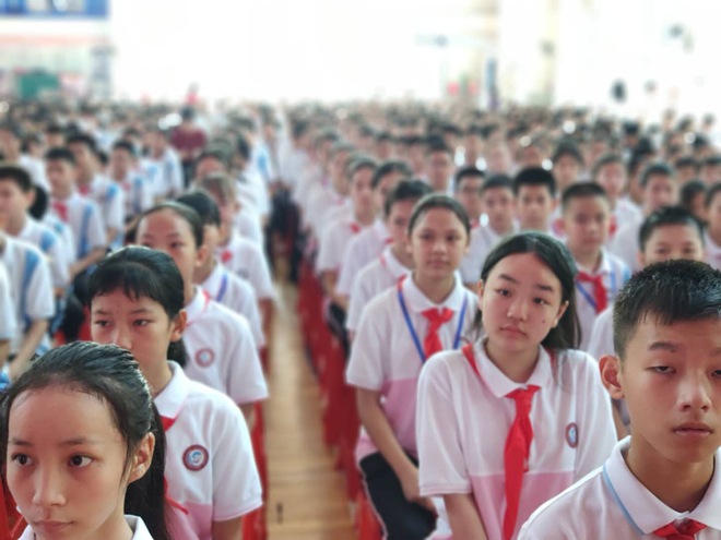 同學們放好自行車,進入教室,安靜坐好,等待著老師的到來。充滿愛心的班主任,帶著和藹的笑容進入教室,親切地和同學們進行交流。短暫的要求學習后,便去學校體育館進行開學典禮。