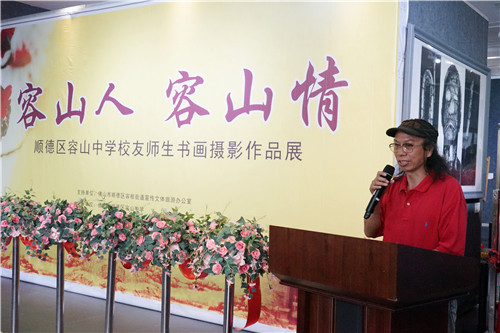 原廣州美院版畫系主任、廣州美術學院教授李全民在儀式上,他闡述了自己與順德藝術的淵源,充分肯定了順德藝術教育的滲透力,感嘆順德藝術的發展,看到我校舉辦的容山人容山情校友師生書畫攝影作品展使其更加加深了對順德藝術文化的情結,李全民教授預祝容山中學本次校友師生書畫攝影作品展順利開展。