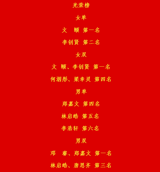 華僑中學代表順德區參加高中組別的比賽,本次比賽的運動員有:林啟皓、李浩軒、唐思齊、鄭嘉文、鄧睿、文頤、李釗賢、何洇彤、梁幸靈。郭千軍老師、杜亮老師擔任教練。為了備戰此次比賽,在教練的帶領下,華僑中學乒乓球隊隊員刻苦訓練,面對困難與疲勞,他們沒有畏懼和退縮,任汗水打濕脊背,任疲憊爬滿全身依然奮力堅持,因為他們只有一個目標,就是拿下要拿冠軍,為團隊贏得榮譽。天道酬勤,運動員在賽場上不畏強敵,冷靜應戰,艱苦拼搏,最終獲得高中組團體總分第一名的優異成績,文頤同學勇奪女單和女雙冠軍被評為“最佳運動員”,為華僑中學和順德區爭取了榮譽。