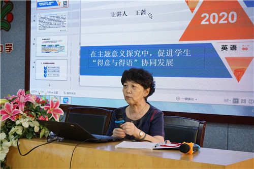 在講座環節,王薔教授以“在主題意義探究中,促進學生‘得意與得語’協同發展”為題,高屋建瓴地提出語言的教育要避免鐘擺效應,走極端,在教學傳承上,切忌“Throw the baby out with the bath water”。教師要以始終關注培養學生正確的價值觀、必備品格及關鍵能力的核心素養為己任。王教授強調英語課程目標的轉型,廣大教師要關注學科的育人價值、 學生的發展思維和核心素養的落地,在重組課程內容的同時要注重以主題為引領、以語篇為依托。為了讓講座更深入淺出,王教授以具體的課堂教案為范例,點對點講解如何在實際教學中探究主題意義,落實各項教育教學目標。