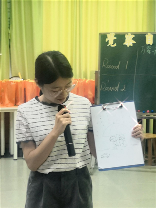 活動(dòng)通過(guò)“小雞進(jìn)行曲”游戲展開(kāi)破冰之旅,幫助老師們放松身心,以更好的狀態(tài)投入到本次活動(dòng)當(dāng)中。在場(chǎng)的老師們?cè)跇?lè)老師的邀請(qǐng)下,通過(guò)模仿小雞的動(dòng)作,一蹦一跳地投入到活動(dòng)中,活躍團(tuán)隊(duì)氣氛,讓老師們以更加開(kāi)放的心態(tài)投入本次團(tuán)輔;隨后的分組活動(dòng)中,老師們運(yùn)用自己天馬行空的腦洞,展示了特色明顯的小組標(biāo)志動(dòng)作。接下來(lái),進(jìn)行的是繪畫(huà)“雨中人”活動(dòng),樂(lè)老師希望在本輪活動(dòng)中,能夠幫助班主任老師們學(xué)會(huì)覺(jué)察工作中的壓力,嘗試自我接納。老師們繪畫(huà)完畢后,高三17班班主任李健敏老師向在場(chǎng)的老師們分享到了她的創(chuàng)作是兩個(gè)人結(jié)伴地?fù)纹鹜话褌悖幸环N風(fēng)雨同舟的感覺(jué);陳金玲老師分享了自己向黃俊老師學(xué)習(xí)如何當(dāng)高三年級(jí)班主任的事情,很感謝黃俊老師對(duì)她的無(wú)私幫助以及經(jīng)驗(yàn)分享;同時(shí),黃俊老師也分享了他的想法,他認(rèn)為在“雨中人”的圖中,或許很多老師都是以自己是圖中人的角度來(lái)進(jìn)行創(chuàng)作的,但是黃老師卻認(rèn)為自己是圖中的傘,傘下的人是他的學(xué)生們,黃老師表示在從教的時(shí)間里,他都愿意像圖中傘一樣,保護(hù)著傘下的學(xué)生一起邁過(guò)高三中的所有風(fēng)雨。