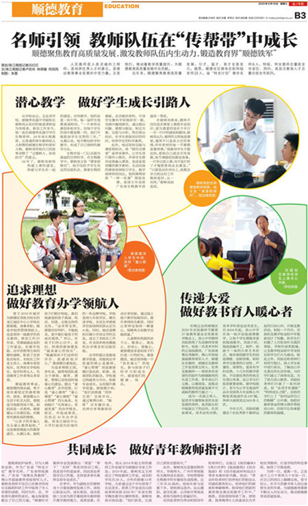 近日,在順德區2020年慶祝教師節暨第27屆教育基金會獎教獎學晚會上,我校教師劉磊獲得了先進教師榮譽稱號。昨日,珠江商報教育版報道了我校劉磊老師的教育事跡。