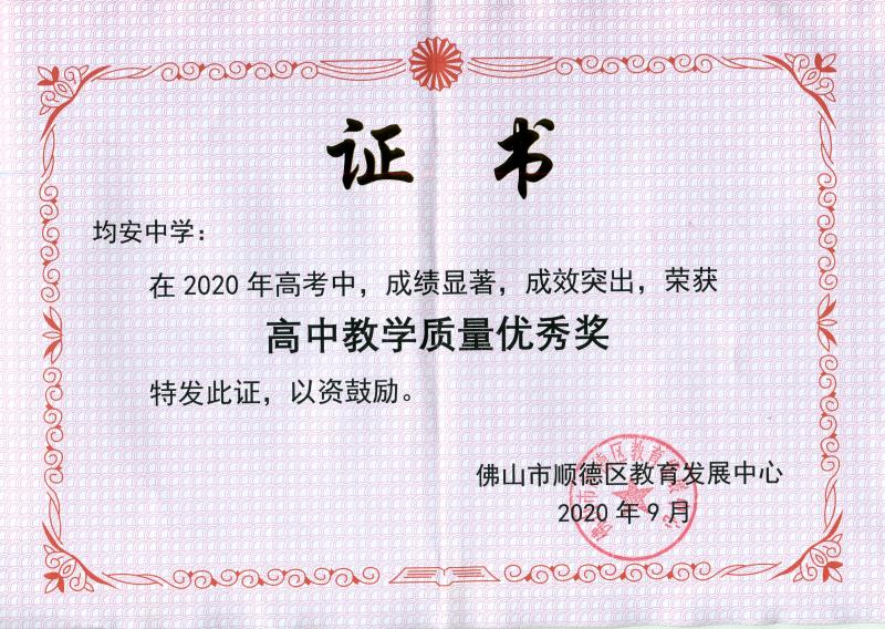 均安中學榮獲“2020年高中教學質量優秀獎”!