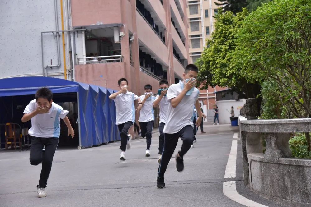 17:08分,短短4分38秒時間,全校兩千余人分別從宿舍及教學樓安全疏散至運動場。同學們用濕毛巾捂著鼻子,模擬在真實火災中避免吸入過多濃煙。各班班長清點本班人數并報告班主任,匯總至級長,確保學生一個也不能少。同時,消防車立刻趕往學校,模擬救火情況。