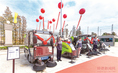 活動現場展示了純電動桶裝鉸接式掃路機器人、純電動自跟隨清吸機器人、智能洗地機器人、智能環衛潔掃機器人等多個在盈峰環境順德產業園生產制造的智能小型環衛機器人裝備產品。