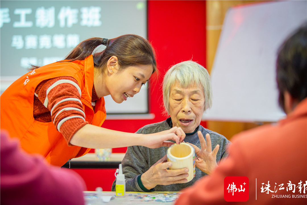 龍眼村老人活動中心“德康園”開設長者手工制作 班,長者與義工一起制作馬賽克筆筒。