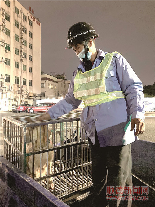 12 月16 日晚,順德區城市管理和綜合執法局聯動十鎮街分局開展了區鎮兩級文明養犬執法行動。圖為執法人員安撫被抓捕的金毛。