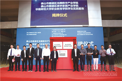 11月24日上午,順德區龍騰數字產業學院、順德區美學家居產業學院、華南師范大學職業教育學院學生實踐基地揭牌儀式在龍江職業技術學校舉行。/龍江宣辦供圖
