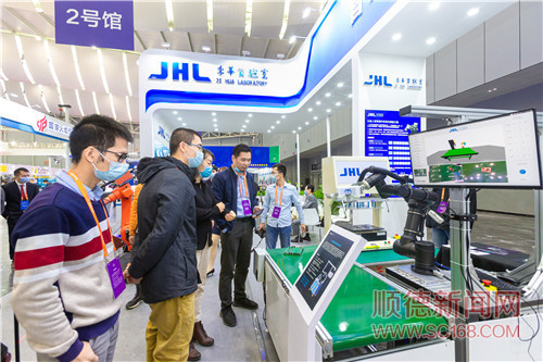 昨日,2020佛山國際智能機器人博覽會在譚洲國際會展中心舉辦。圖為會展中心新松機器人的攤位吸引著眾多前來觀展的客人。/珠江商報記者何冠洪攝