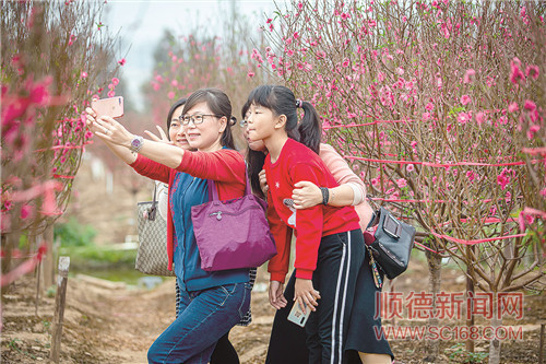 去年1 月11 日舉辦的第二屆勒流連杜桃花會暨桃花鄉宴品鑒活動中,市民正在桃花林中自拍。