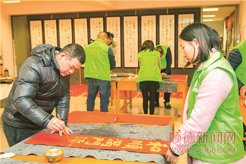 書畫愛好者們揮毫寫春聯,為困難家庭送溫暖。