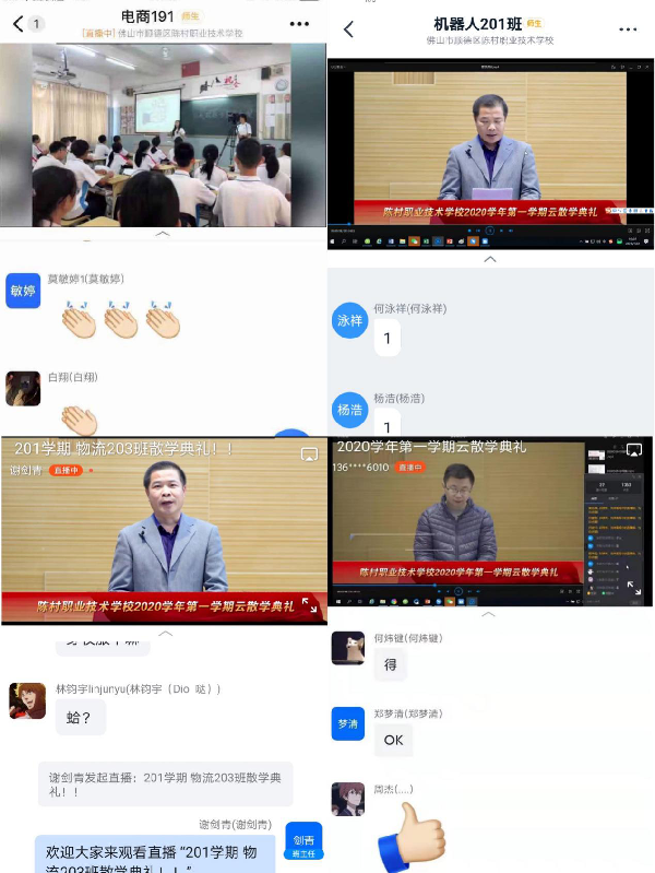隨后,順德區(qū)第一職業(yè)教育集團(tuán)黨委書記、陳村職校校長梁澤洪在云端發(fā)表了熱情洋溢的致辭。梁校長在致辭中強(qiáng)調(diào),2020年是極不平凡的一年,雖然疫情當(dāng)前,學(xué)校依然在教育教學(xué)和競(jìng)賽活動(dòng)方面取得了驕人的成績,這是全校師生共同努力的結(jié)果,希望2021年大家能夠保持初心,砥礪前行。最后,梁校長對(duì)師生假期期間提出了幾點(diǎn)期望,一是關(guān)注形勢(shì),加強(qiáng)科學(xué)防控;二是提高警惕,增強(qiáng)安全意識(shí);三是合理安排,充實(shí)假期生活。