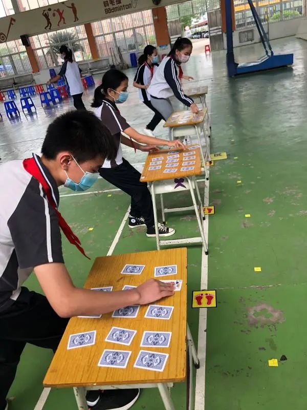 第二個活動是翻牌活動。經(jīng)過分組,全班同學分成4組,每組同學排成一隊,逐個上前翻牌,一次只能翻一張牌,組員們需要將牌面是1-K的撲克牌按順序翻出,率先完成的小組為勝。