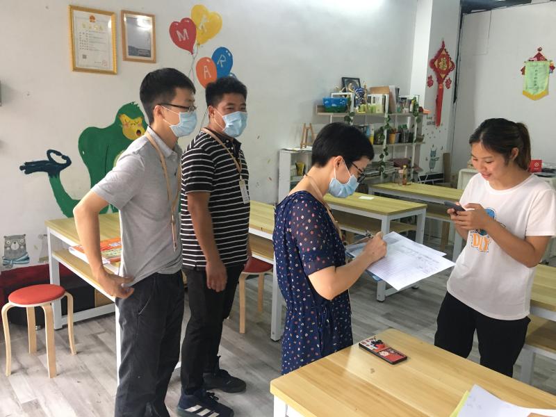 檢查主要圍繞兩方面:一個是無牌無證及未經核驗的校外培訓、托管機構專項整治;另一個是創文專項檢查,圍繞“1.社會主義核心價值觀海報張貼2.禁煙標識張貼3.創文廣告張貼4.分類垃圾桶擺放和標識5.背誦社會主義核心價值觀24字6.場室的衛生清潔7.消防器材和消防檢查記錄”這七個方面進行重點檢查。