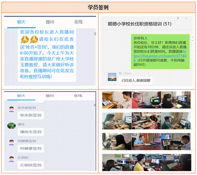 本次直播活動采用線上簽到和線下拍照相結合的簽到方式,并做好開播前提醒和直播中監控工作,確保全體學員參與直播活動。