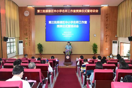 2020年6月30日,第三批順德區(qū)中小學(xué)名師工作室授牌儀式暨培訓(xùn)會(huì)在順德區(qū)華僑中學(xué)實(shí)驗(yàn)室一樓階梯室隆重舉行。廣東省中小學(xué)教師培訓(xùn)專家工作室主持人、肇慶學(xué)院副院長(zhǎng)肖起清教授,區(qū)教育局冼彌冬副局長(zhǎng),區(qū)教育局組織人事科劉進(jìn)華科長(zhǎng)、曾麗輝副科長(zhǎng),區(qū)教育發(fā)展中心何儀昌副書(shū)記,區(qū)教育發(fā)展中心教師發(fā)展研究室唐信焱主任、吳海堅(jiān)副主任,區(qū)教育局、區(qū)教育發(fā)展中心相關(guān)領(lǐng)導(dǎo)和老師,以及我區(qū)第三批名師工作室首席主持人、項(xiàng)目主持人近140人參加了本次會(huì)議。會(huì)議由劉進(jìn)華科長(zhǎng)主持。