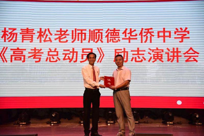 順德華僑中學校長吳劍平為楊青松老師頒發紀念證書