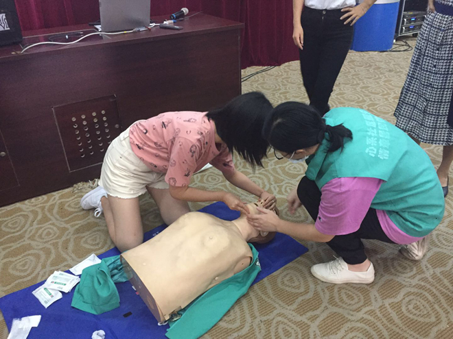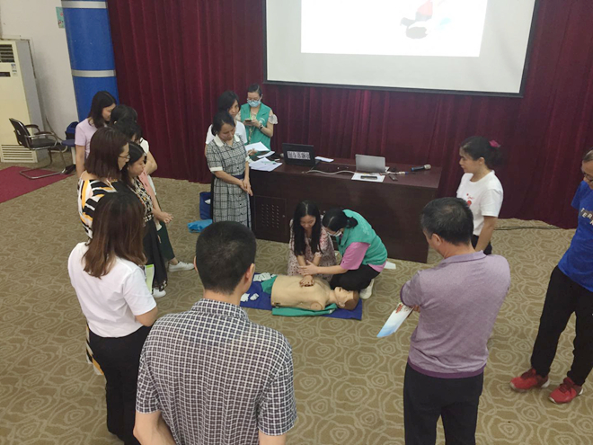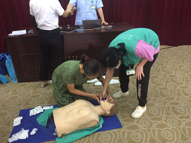 本次知識講座分為理論知識講解和實際操作兩部分,張醫生采用PPT形式,從心跳呼吸驟停可發生的場所、個體、心肺復蘇概念、黃金救命時間等方面做了詳細的介紹,同時結合不同傷情下應采取的不同急救措施,對心肺復蘇各環節技術和流程進行了現場示范。