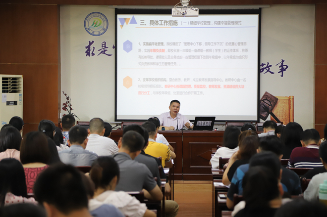 隨后,學校領導班子成員分別就學校教學、德育、特色社團等各項工作做了重要講話。葉麗燕副校長主要從管理、教科研和書香校園建設活動三大方面對新學期教學教研工作進行部署,希望我校教學成績更上一層樓。何慧榮副校長主要從教育理念、德育隊伍建設、學生干部隊伍建設、家校聯系、養成教育和校園文化方面對新學期德育工作進行安排,希望良好的德育能為學生錦上添花。廖檳強書記則從學校特色社團方面展開布置,希望新學期我校特色社團更加燦爛多姿。伍其印主任和嚴冬花主任分別從教師紀律和安全方面做出要求,保障學校在教育教學期間安全有序。