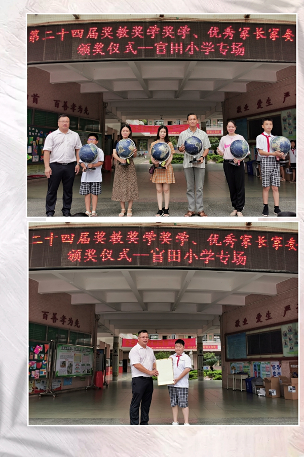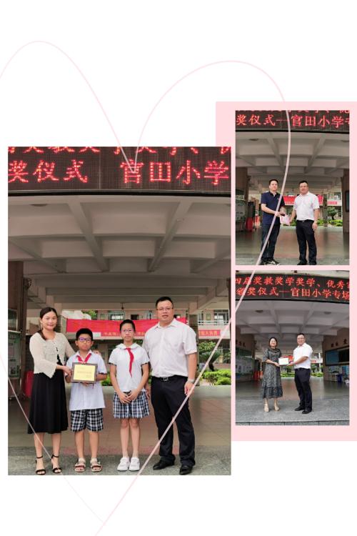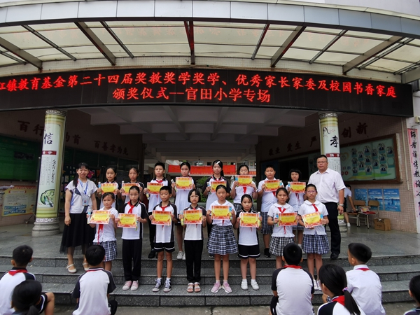 9月14日升旗儀式后官田小學舉行了2020年龍江鎮教育基金會第二十四屆獎教獎學獎學、獎家長及暑假讀一本好書頒獎儀式官田小學專場頒獎儀式,此儀式全體師生及獲獎家長、獲獎畢業生家長參與,由周加奇老師主持,鄧文波、周紅玉兩位校長給獲獎學生和家長頒獎。
