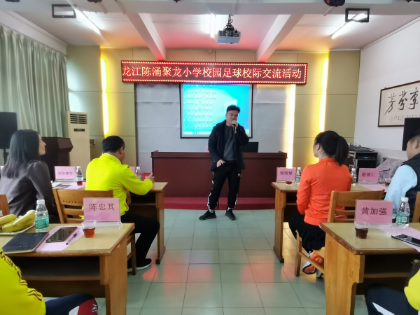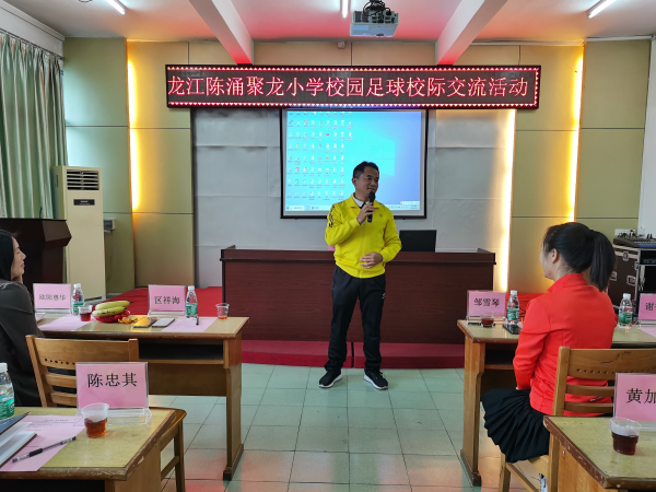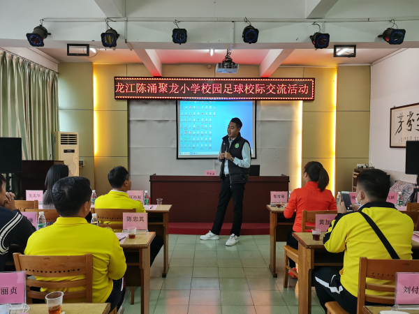 本次蒞臨我校交流指導的學校有均安星槎小學葉飛躍校長、劉付小花主任助理、陳其翱體育科組長等;均安富教小學吳美華校長、歐陽麗貞主任等;陳村梁釗林紀念小學區祥海校長、黃加強主任、陳忠其科組長等;均安倉門小學歐陽惠華校長、陳笑蘭主任等;還有龍江旺崗小學李少強校長等。一映入來訪者眼簾的是聚龍小學的足球文化宣傳欄,校道上展示著聚龍小學的足球小明星、足球相關的文化,教學樓中軸走廊向來訪者展示的聚龍動感十足、極具特色的足球操表演。